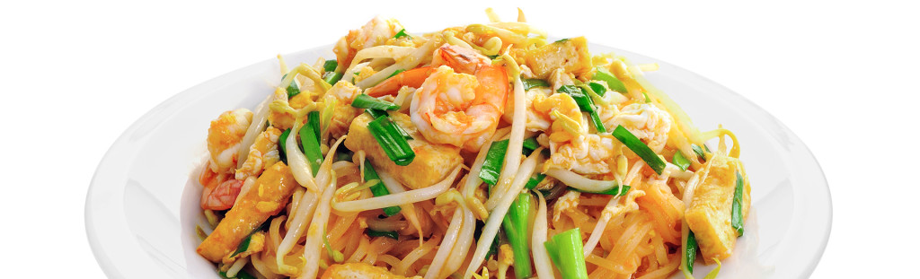Stir fried rice noodles and egg with chicken, pork or beef topped with mung sprouts.